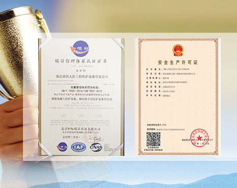 通過(guò)ISO9001質(zhì)量管理體系認(rèn)證、系國(guó)家人民防空辦公室批準(zhǔn)的人防防護(hù)設(shè)備定點(diǎn)生產(chǎn)和安裝企業(yè)